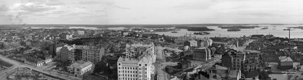 1912. Näköala Kallion kirkon tornista kaakkoon, itään ja koilliseen. Etualalla oikealla Kallion kirjasto. Taustalla Sörnäisten niemi ja Sörnäisten satama sekä Kana, Hanasaari ja Sompasaari.