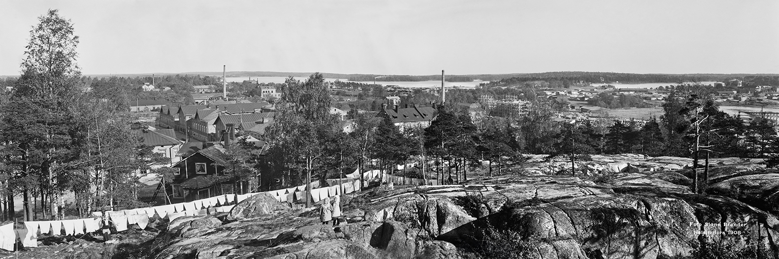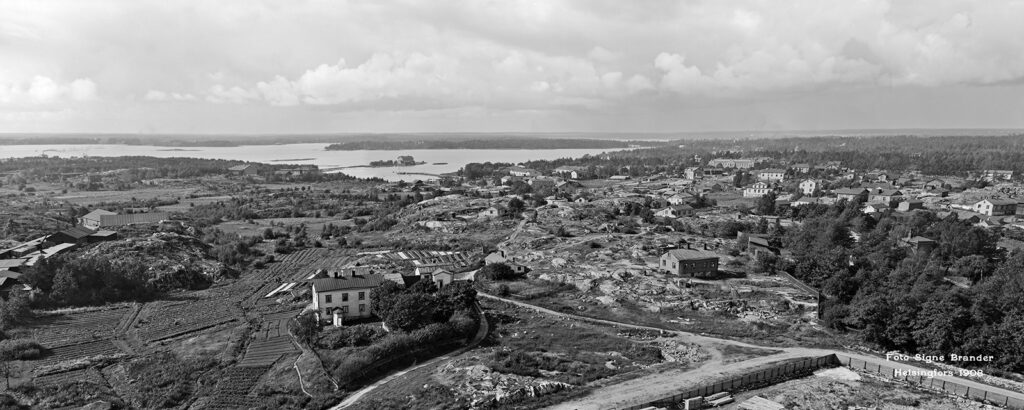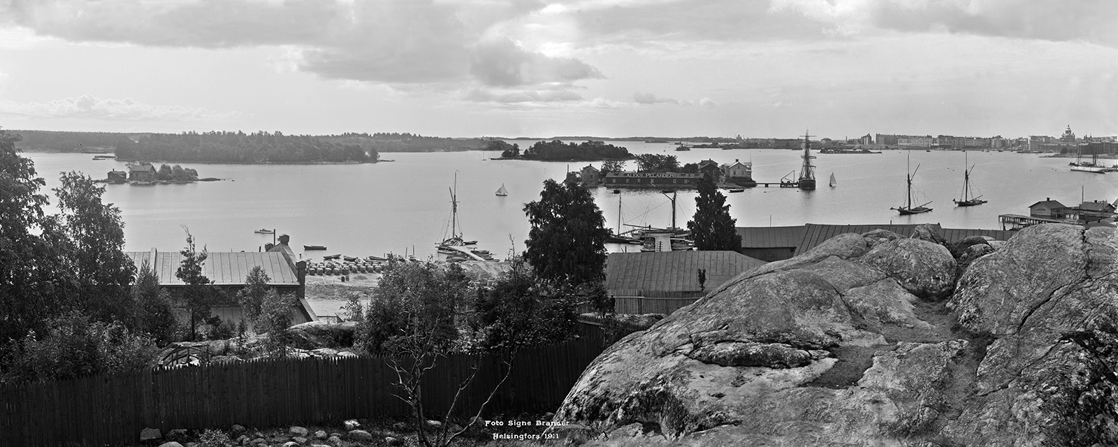1911. Näköala Vilhonvuorelta (nykyinen Katri Valan puisto) kaakkoon ja etelään. Keskellä Kana ja Sompasaari.