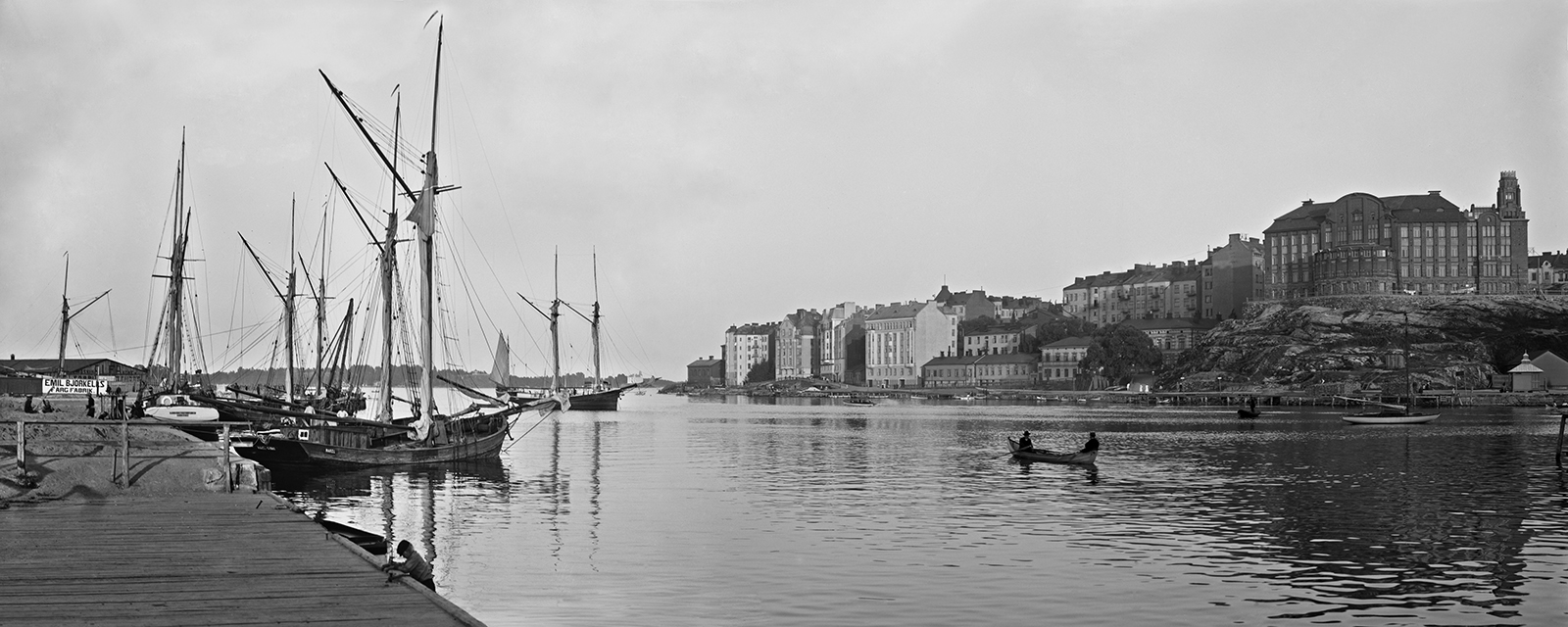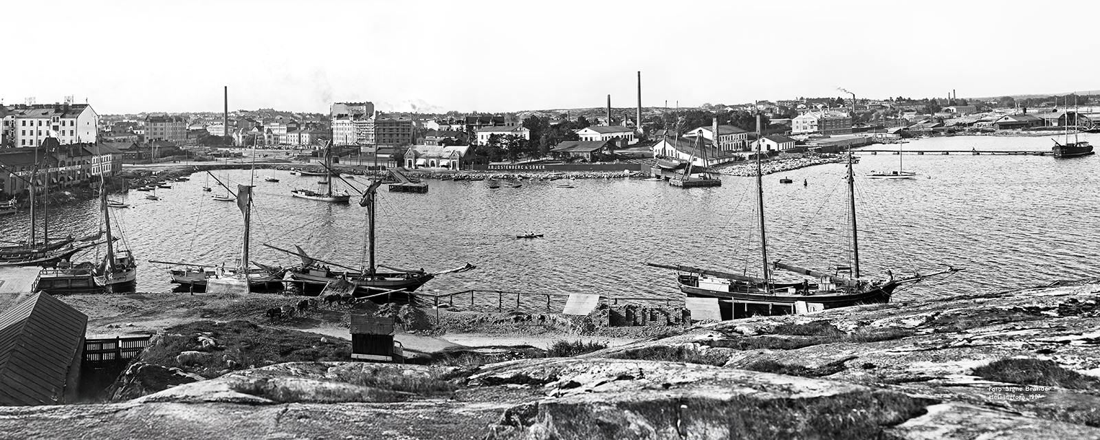 1907. Siltavuorensatama. Vasemmalla Siltasaarenkatu 1, John Stenbergin konetehdas. Nykyinen John Stenbergin ranta 4. Vasemmalla Hakaniementori. Hakaniemenranta 3, AB J. D. Stenberg & söner. Kuvattu Siltavuorelta pohjoiseen.