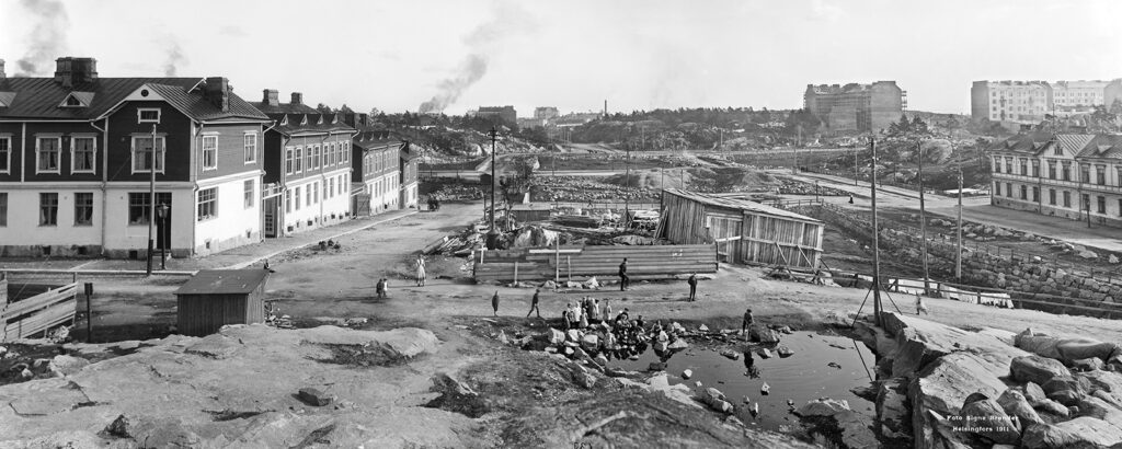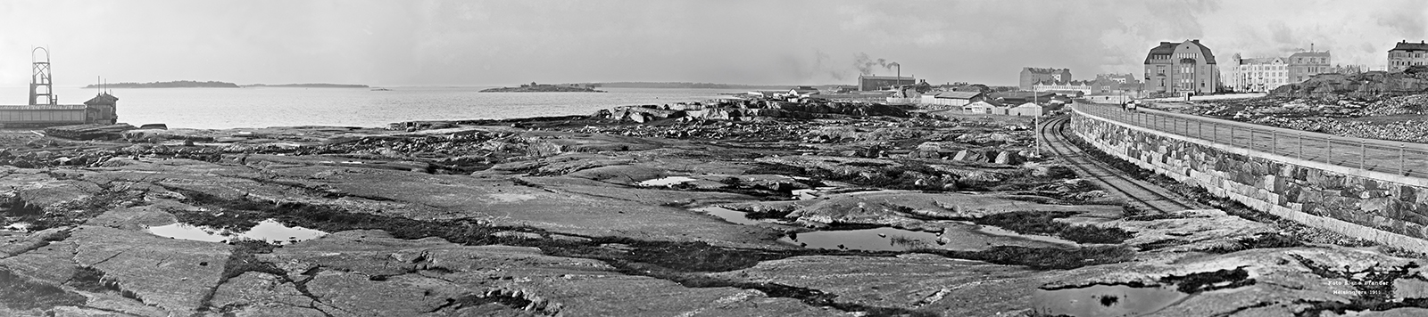 1911. Ursinin kallio ja uimalaitos. Satamarata. Oikealla Speranskintie (nykyinen Merikatu).