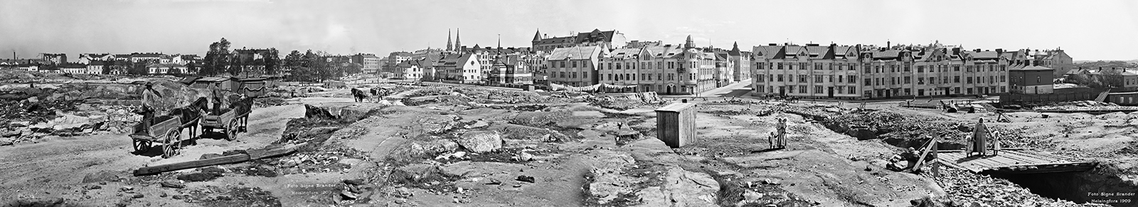 Yksi mielestäni Branderin parhaista panoraamoista. Hieno sommittelu. Katujen linjat ohjaavat katseen kauas Kallion kallioille. Etualalla leikkiviä lapsia. Etualan kalliot on vieläkin paikallaan. Keskellä olevalle tontilla on nykyinen Helsingin Urheilutalo.