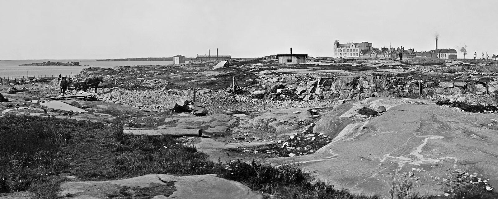 1909. Eiran kallioita. Taustalla vasemmalta Melkki, sen edessä pieni Hernesaarenkari, Hernesaari ja Lauttasaari. Munkkisaaren nahka-, remmi- ja kenkätehdas. Oikealla talot Speranskintie3/Telakkakatu 1 ja Speranskintie 1/Perämiehenkatu 2. Molemmat talot jäljellä. Niiden oikealla puolella näkyy silloinen Karl Fazerin suklaatehdas (purettu). Kuvattu nykyisen Armfeltintie 7:n kohdalta lounaaseen ja länteen.