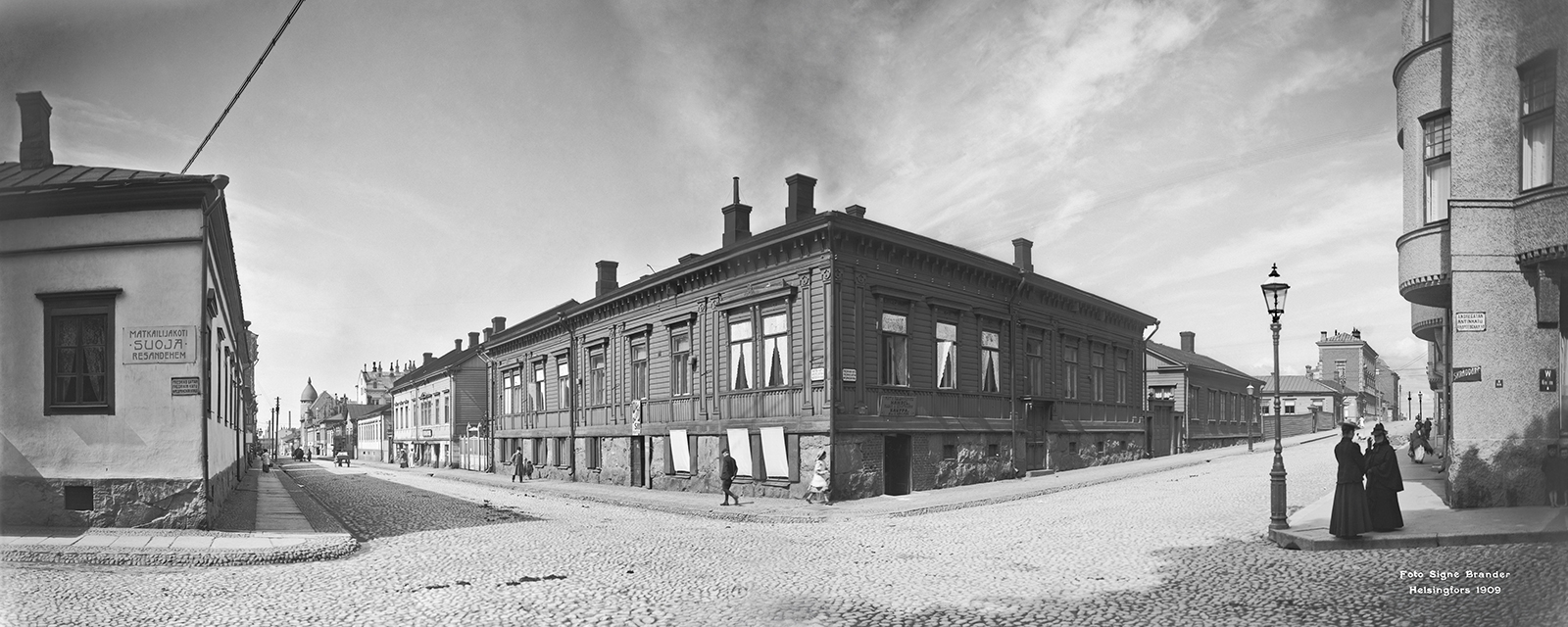 Antinkatu (nykyinen Lönnrotinkatu ) 16 vasemmalla, 17, 19, 21. Fredrikinkatu 32, 34 . Nähtynä Fredrikinkadun ja Antinkadun (nykyinen Lönnrotinkatu) kulmasta.