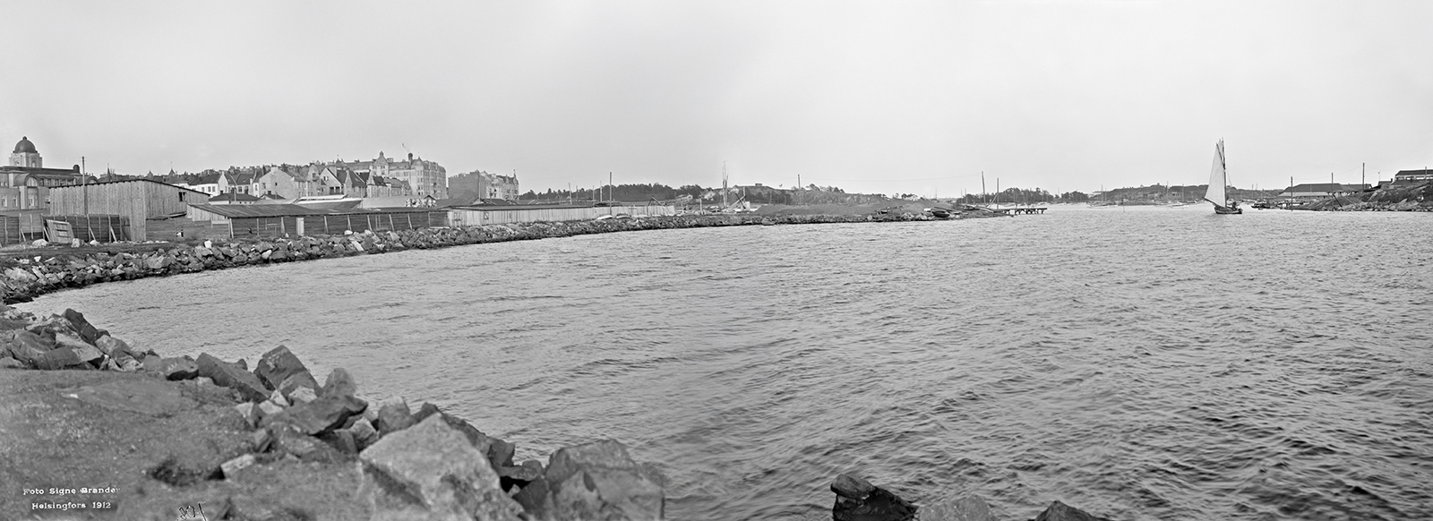 1912. Merisatamanranta ja Sirpalesalmi. Oikealla Sirpalesaari. Kuvattu Ursinin uimalaitoksen luota itään ja kaakkoon.