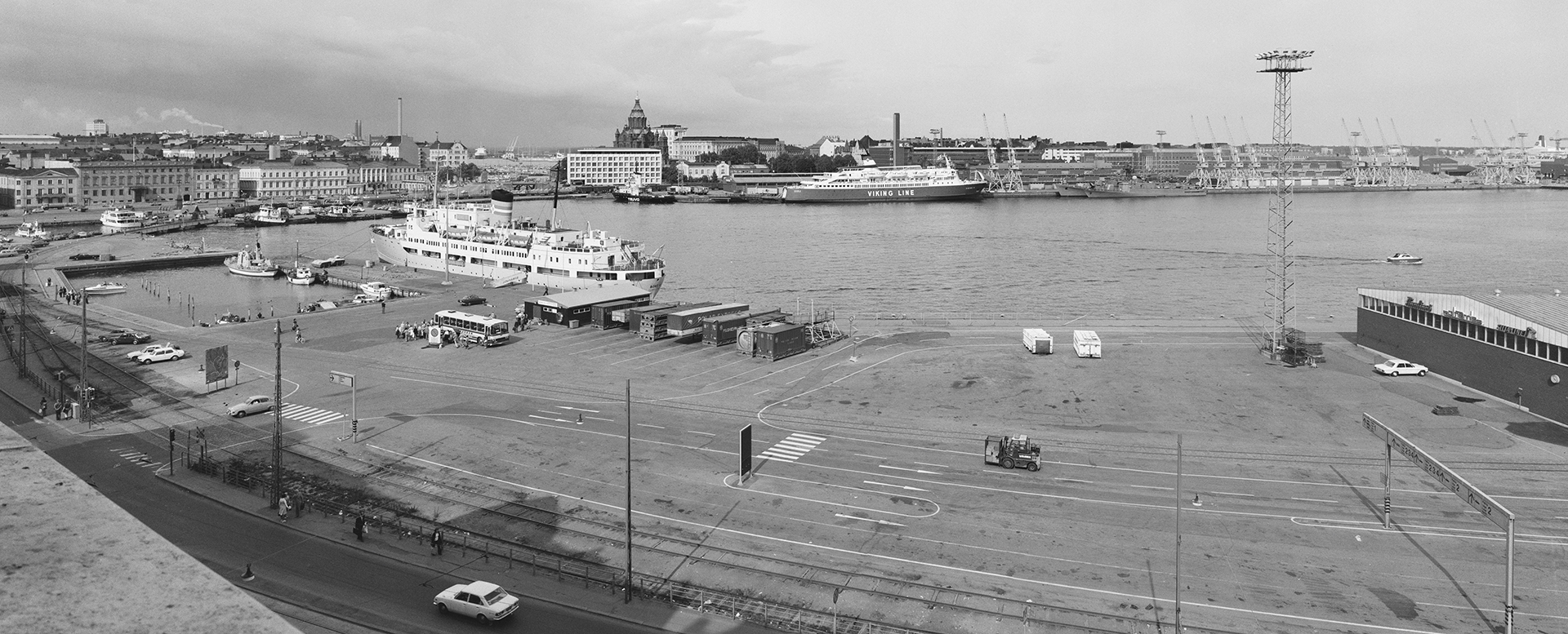 Eteläsatama 1977. Vasemmalla taka-alalla Katajanokan laituri ja Katajanokan terminaali. Etualalla oikealla Makasiinilaituri. Taka-alalla oikealla Valkosaaret. Kuvattu Eteläranta 10:n kattoterassilta etelä-kaakkoon päin.