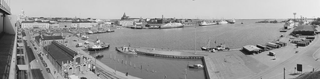 Eteläsatama 1977. Makasiinilaituri ja Makasiiniterminaali. Taustalla vasemmalla Kauppatori ja Pohjoisesplanadi. Taustalla oikealla Katajanokka ja Katajanokan laituri. Etualalla Bore III lähdössä Tallinnaan.