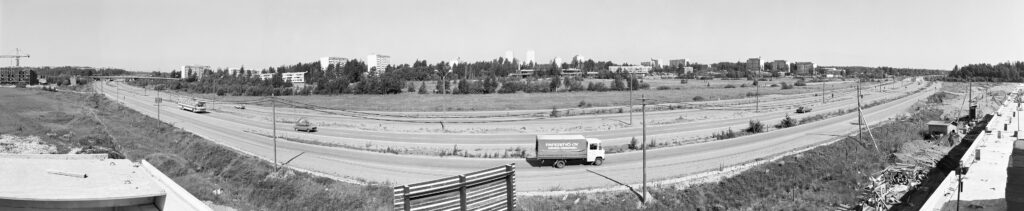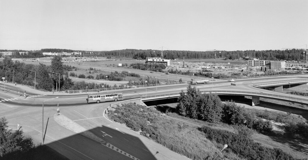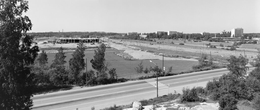 1976. Itäkeskus. Näkymä Citymarketin katolta länteen Marjaniementien sillalle. Oik. Itäväylä. Taustalla Raaseporintie 1 (oik.) ja Asiakkaankatu 6 rakenteilla (vas.).