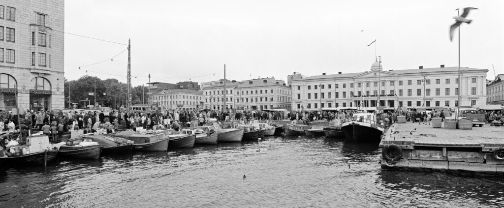 1976. Silakkamarkkinat, saaristolaisten veneitä Kolera-altaassa. Taustalla on Kauppatori sekä Pohjoisesplanadi 19 (vasemmalla), 17, 15, 11-13 (Kaupungintalo).