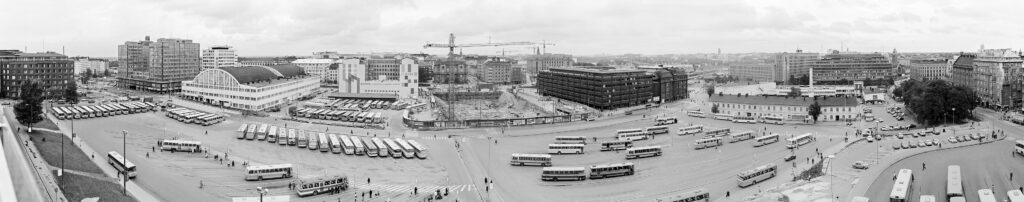 1977. Vasemmalta lukien Fredrikinkatu 44, 46 (Autotalo). Salomonkatu 17, 15 (Tennispalatsi), 13 , Eteläinen Rautatiekatu 6, Salomonkatu 3. Edessä Kampin kenttä, oikealla linja-autoasema, taustalla Sokos-tavaratalo, Simonkatu