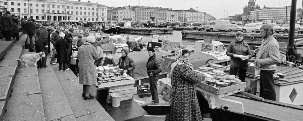 1976. Silakkamarkkinat, kaupantekoa saaristolaisveneestä Kolera-altaalla. Takana on Kauppatoria, torilla keisarinnan kivi. Kauppatorin takana on Pohjoisesplanadi 11-13 (Kaupungintalo), 9, 7, 5. Kuvassa näkyy oikealla Keisarinnan kivi. Taustalla Pohjoisesplanadin taloja, oikealla Katajanokalla Enso-Gutzeitin talo takanaan Uspenskin katedraali.